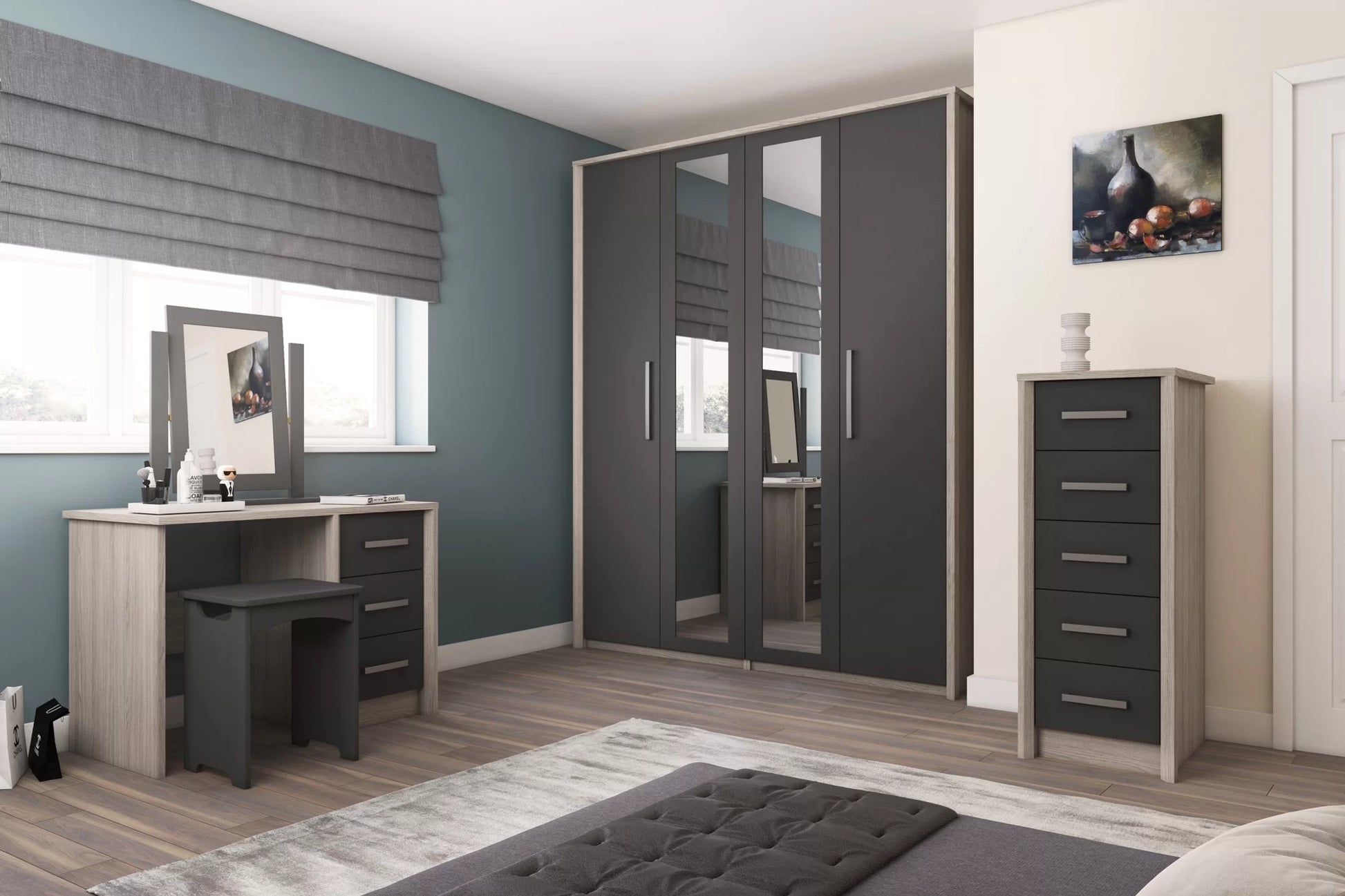 Introducing the Akita range, designed for those who appreciate stunning style and elegance. The beautiful Grey Oak carcass, paired with angled pilasters, sets this range apart. With linen interiors and soft-close fittings on all doors and drawers, the Akita offers both beauty and functionality.