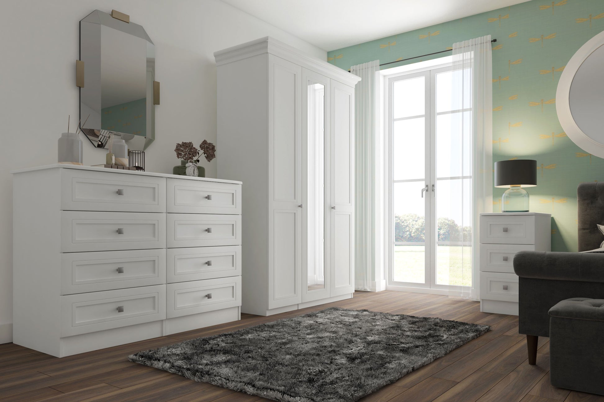 Create a stylish and modern bedroom with Evanton. Choose from 2 color options and enjoy the contemporary Shaker design on the doors and drawers. The decorative corniche adds a touch of elegance, while the brushed aluminium handle complements the overall look. With inset mirrors and heavy duty bases, this wardrobe is both functional and beautiful. Plus, easy glide drawers and factory assembly make it a hassle-free addition to your space.