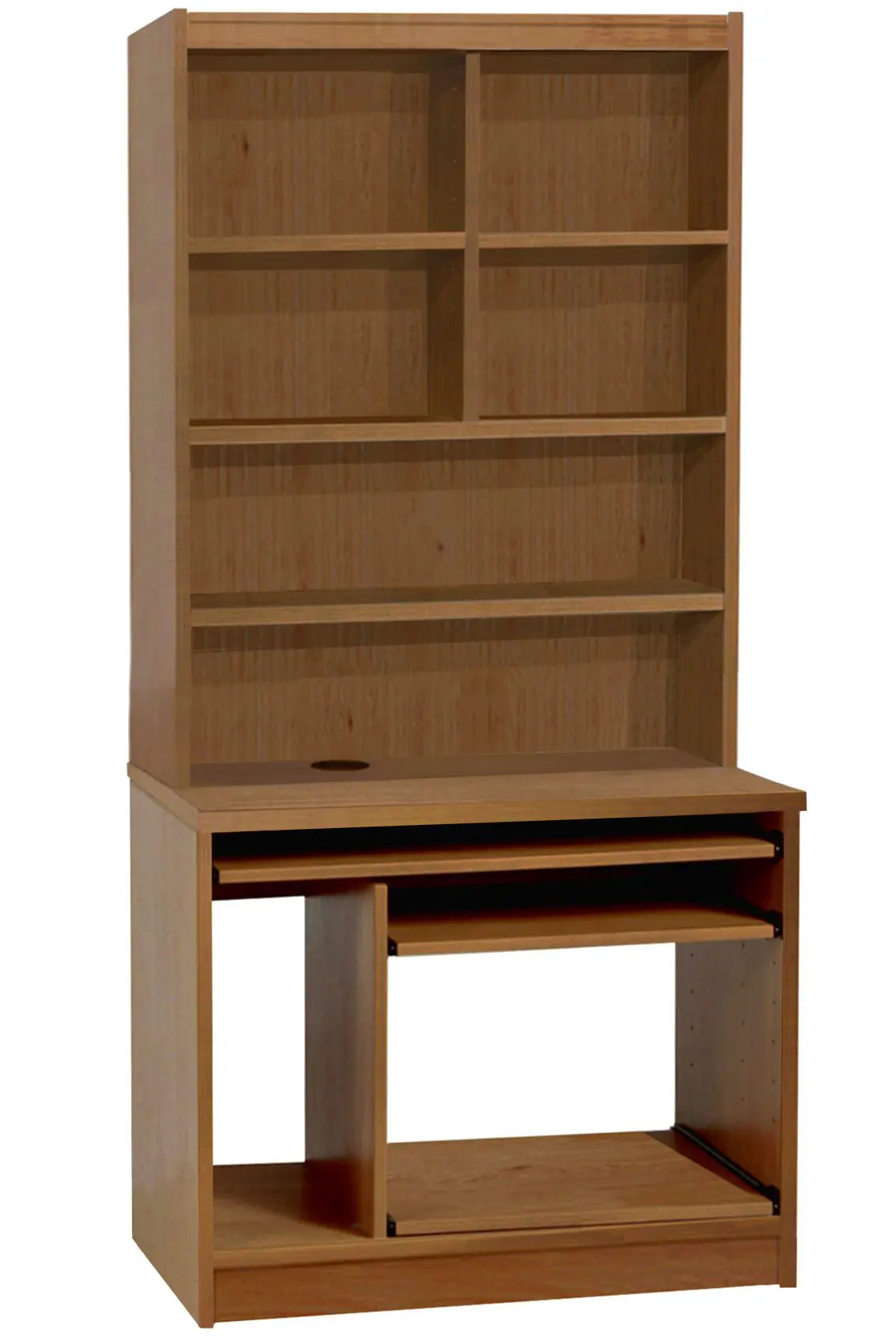This Home Office Desk with Hutch Bookcase is designed for ultimate function and durability. The open back CPU housing and smooth cable management prevent wire trapping. A slide-out keyboard shelf and adjustable shelves provide convenience for all your computer needs. Say goodbye to clutter and discomfort with this efficient work station.