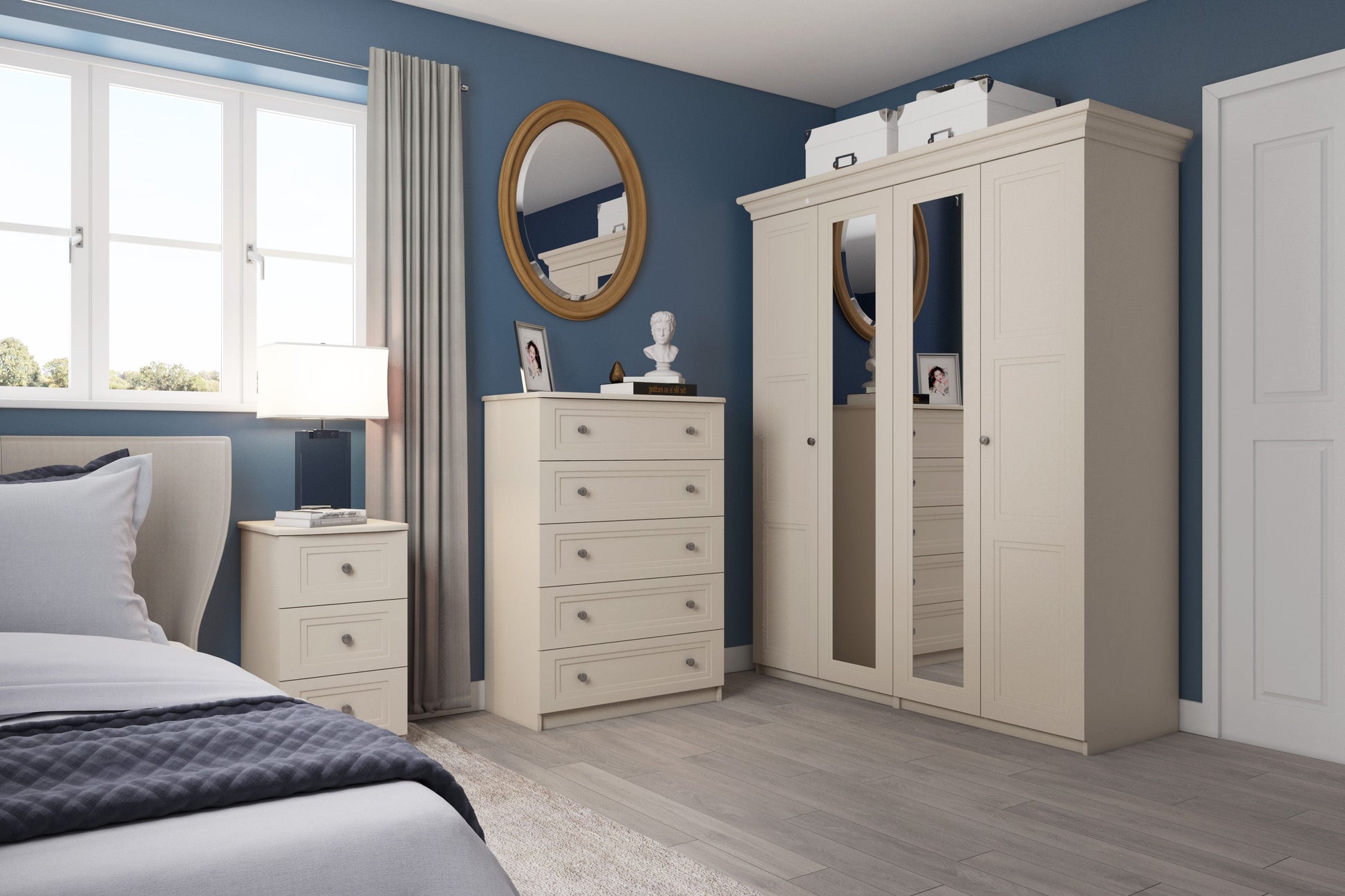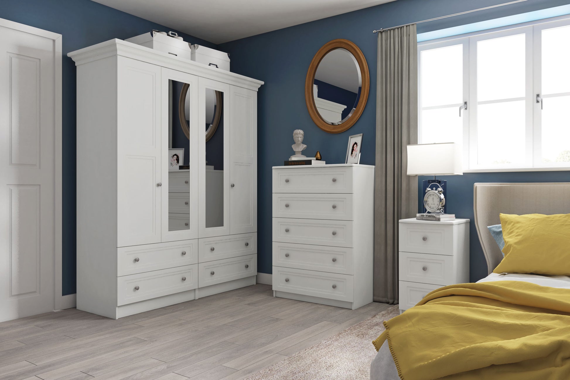 Meet Milton, the stylish solution for your storage needs. Available in 2 colour options, Milton features a double step panel profile, circular metal knobs, and inset mirrors for a modern touch and with easy glide metal runners, this product offers both style and functionality.