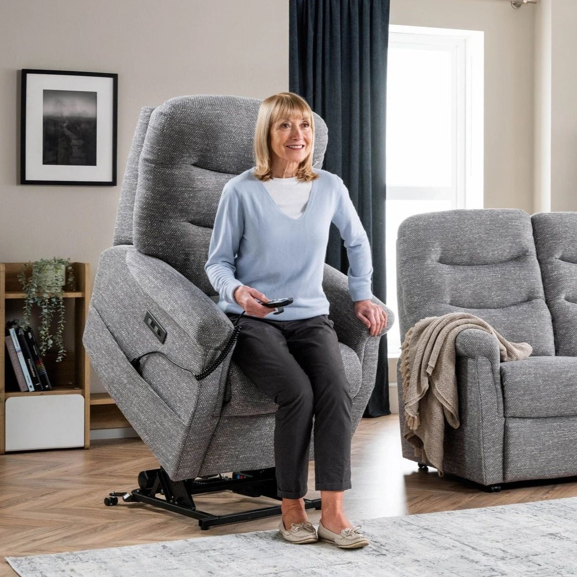 The Hollingwell group is available in all Celebrity Leather & Fabric options. Lift & Tilt riser recliner chairs in 3 sizes as well as 2 and 3 seater sofas available to order. Upgrade your chair for the complete experience with electrically adjustable lumbar support and headrest.