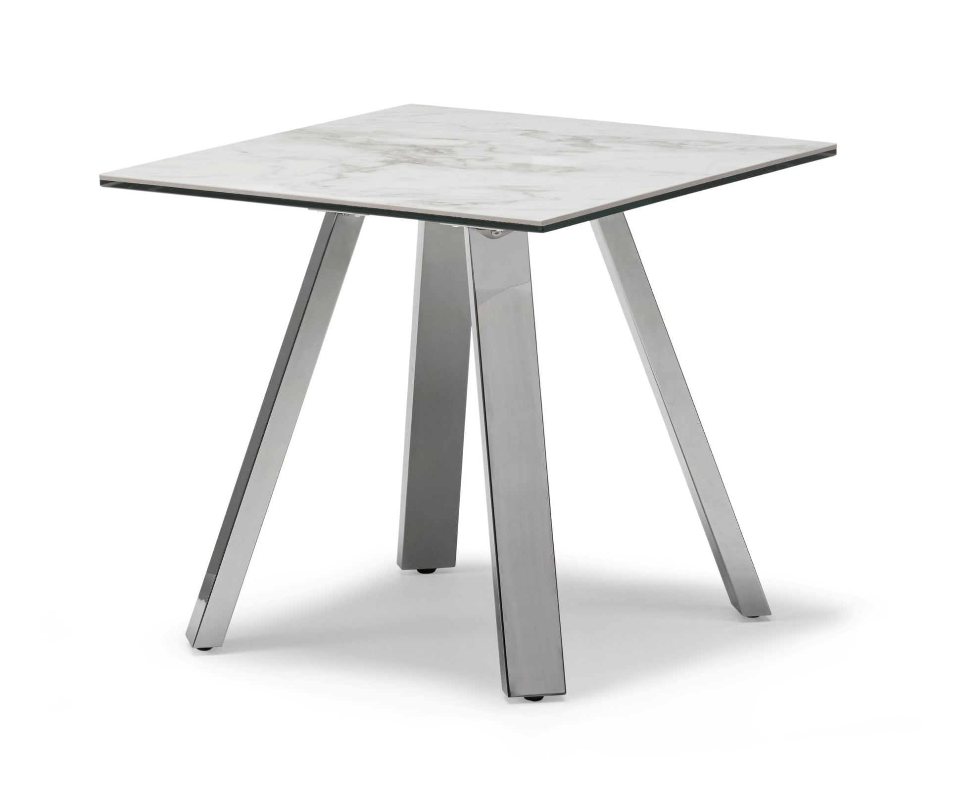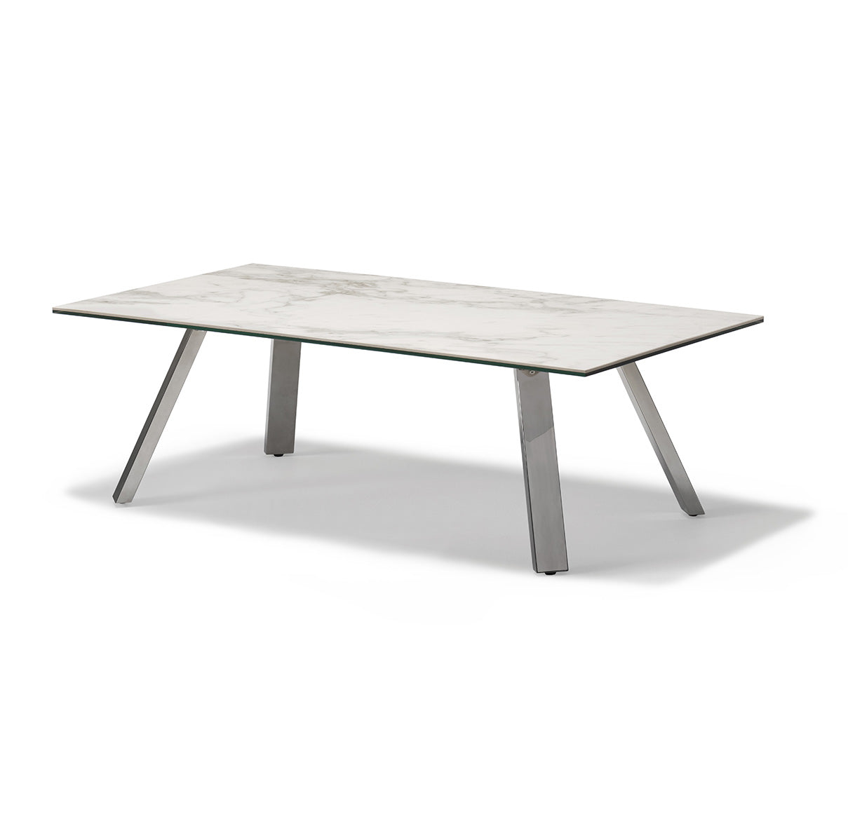 Elevate your space with Pebble - a glamorous, contemporary table that combines a ceramic top with a marble effect, mounted onto polished glass and stainless steel legs. Add a touch of sophistication to your home with this elegant and modern piece of furniture.