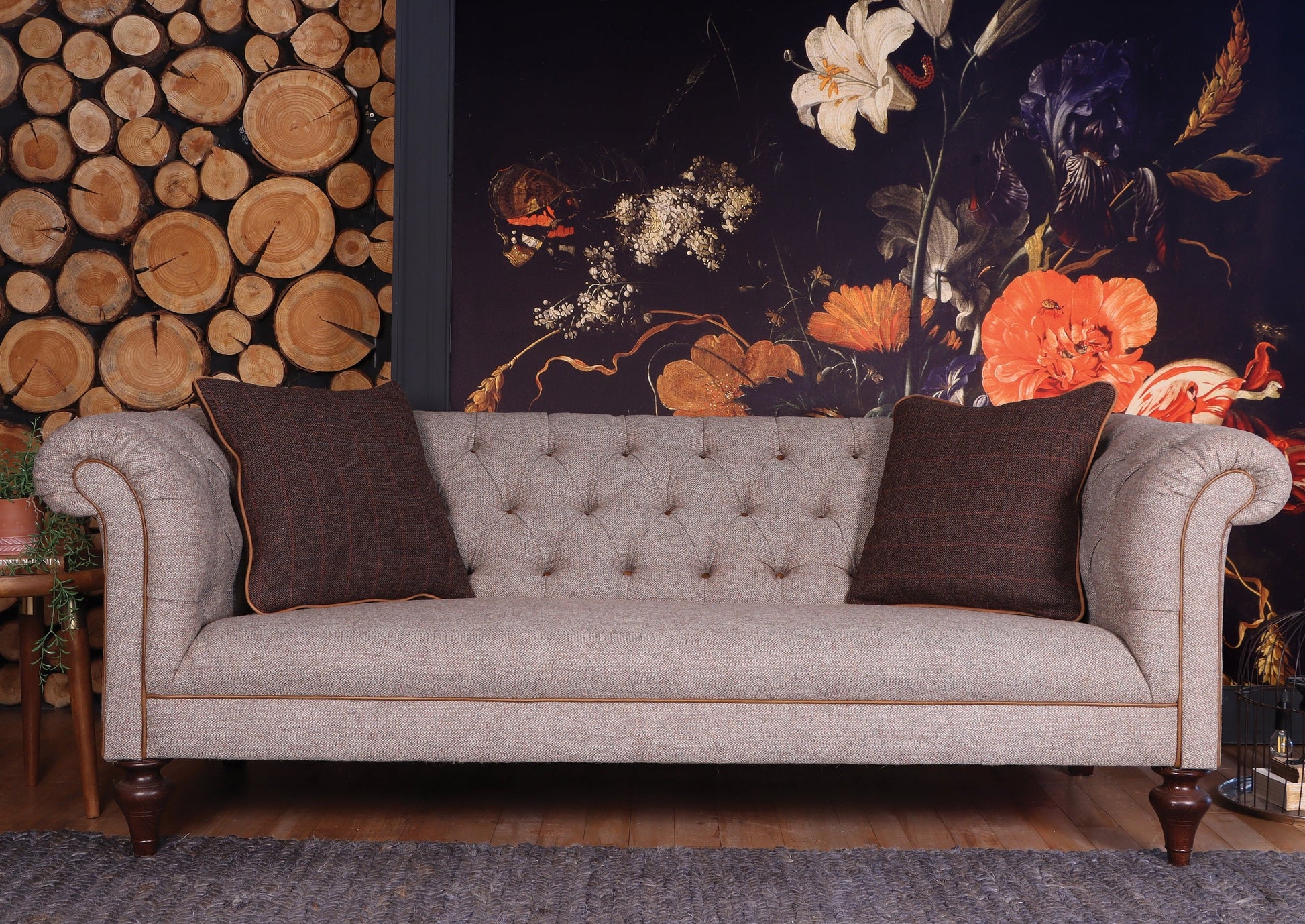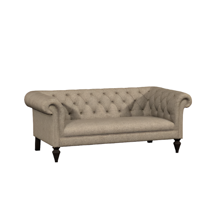 Offering a modern take on regency style, the sofa has a deeply buttoned frame, elegant scroll arms and turned wooden legs.